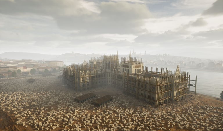 Recreated the Parliament Building in its under-construction state, using architectural plans, sketches, and archival references.